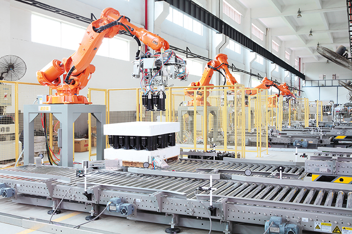 機器人碼垛機是針對中國目前啤酒、飲料、食品行業的特點和應用而設計的一款碼紙箱、塑箱、膜包的碼垛機。用機器人碼垛機可以節省人力,生產效率高,操作方便簡捷。